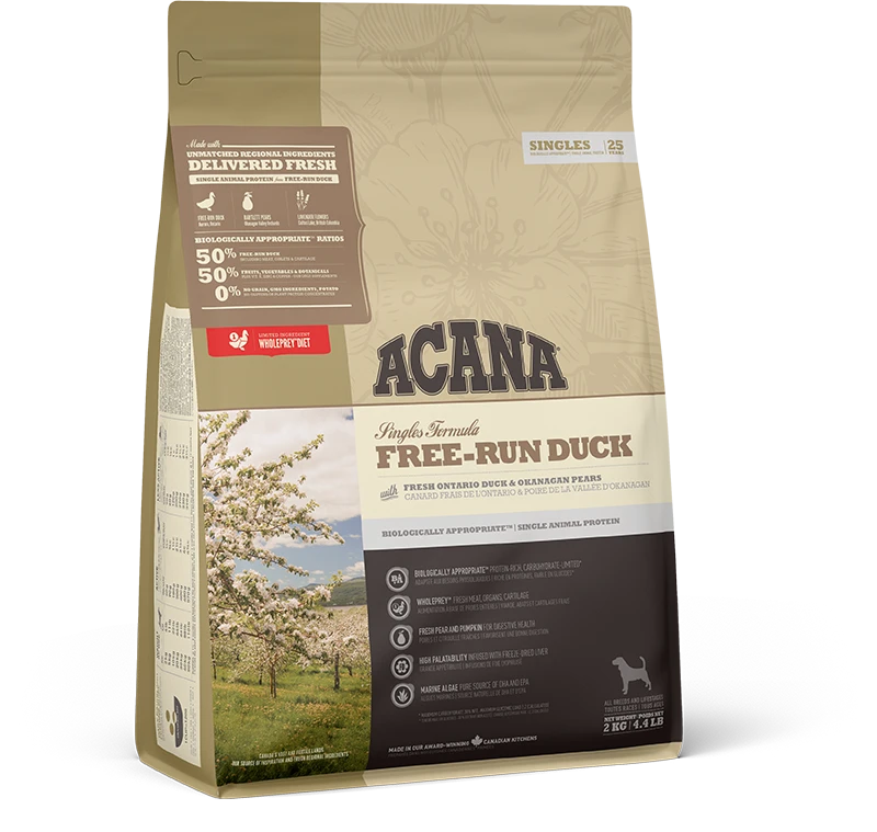 ACANA Singles Free-Run Duck is loaded with 50% quality duck, WholePrey ingredients meat, organs, and cartilage. Complemented with whole, delicious pears, providing your dog with the protein and nutrients they need in order to stay happy, healthy, and strong.