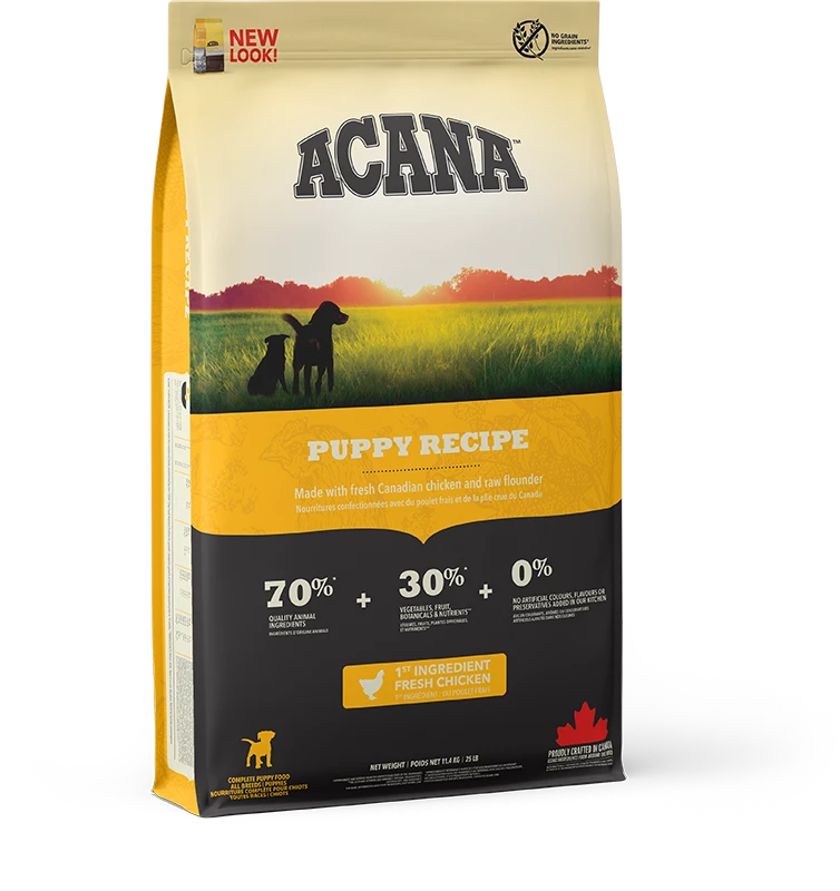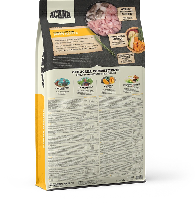 When it comes to ACANA food for dogs, every ingredient matters. That’s why our Puppy Recipe is thoughtfully crafted to nurture growing puppies of all breeds. Rich with 70%1 quality animal ingredients like fresh Canadian chicken and raw flounder balanced with 30% fruit, vegetables & botanicals, this recipe provides your puppy with the protein and nutrition they need to support their rapid development. With quality animal ingredients balanced with fruit, vegetables and botanicals delivered daily, every meal of ACANA Puppy Recipe is like it came from the farmer’s market.