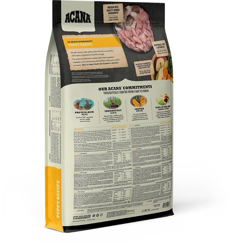 When it comes to ACANA food for dogs, every ingredient matters. That’s why our Puppy Recipe is thoughtfully crafted to nurture growing puppies of all breeds. Rich with 70%1 quality animal ingredients like fresh Canadian chicken and raw flounder balanced with 30% fruit, vegetables & botanicals, this recipe provides your puppy with the protein and nutrition they need to support their rapid development. With quality animal ingredients balanced with fruit, vegetables and botanicals delivered daily, every meal of ACANA Puppy Recipe is like it came from the farmer’s market.