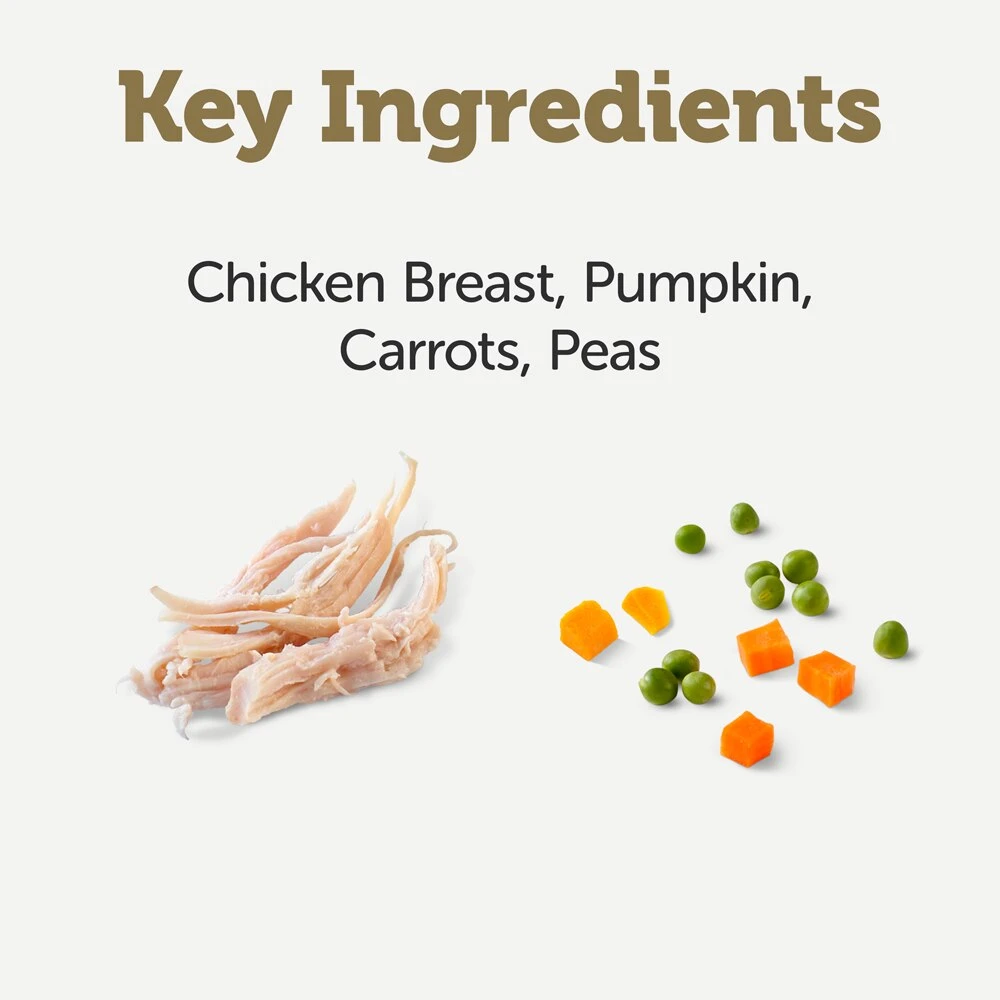 Ingredients: Chicken Breast 45%, Chicken Broth, Pumpkin 8%, Carrots 8%, Peas 8%, Rice.