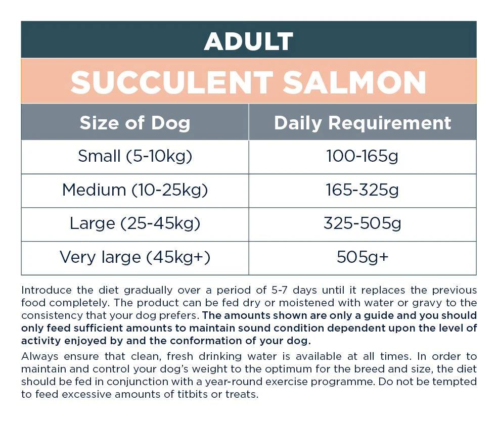 Autarky’s Succulent Salmon Dry Dog Food can be fed dry or moistened with water or gravy to be the consistency that your dog prefers.Typically a thorough mix of 2 parts warm water with 3 parts of dry weight food is preffered. The above amounts are only a guide and you should only feed sufficient amounts to maintain condition dependent upon the level of activity of your dog. Always ensure fresh ckean drinking water is available at all times.