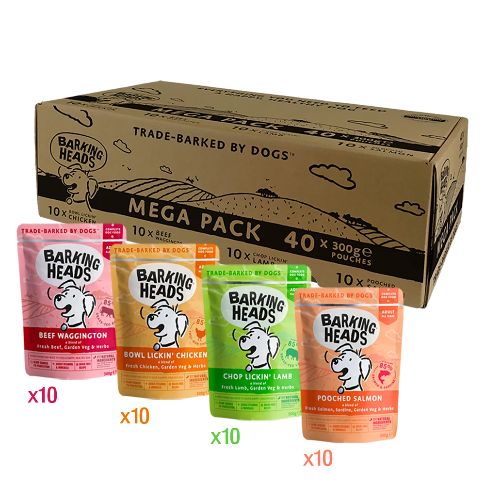 10 x 300g Barking Heads Bowl Lickin’ Chicken, 10 x 300g Barking Heads Beef Waggington, 10 x 300g Barking Heads Chop Lickin’ Lamb, 10 x 300g Barking Heads Pooched Salmon