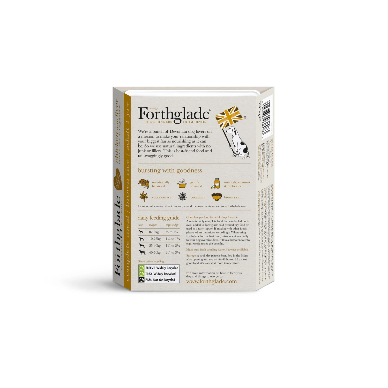 We’re a bunch of Devonian dog lovers on a mission to make your relationship with your biggest fan as nourishing as it can be. So we use no junk or fillers – just 100% natural ingredients. This is best-friend food and tail-waggingly good. A nutritionally complete food that can be fed on it’s own, simply added to a quality mixer biscuit or used as a tasty topper with dry food. If mixing with other foods please adjust quantities accordingly. When using Forthglade for the first time, introduce it gradually to your dog over five days. It’ll take between four to eight weeks to see the benefits. Complete pet food for adult dogs 1 year +.