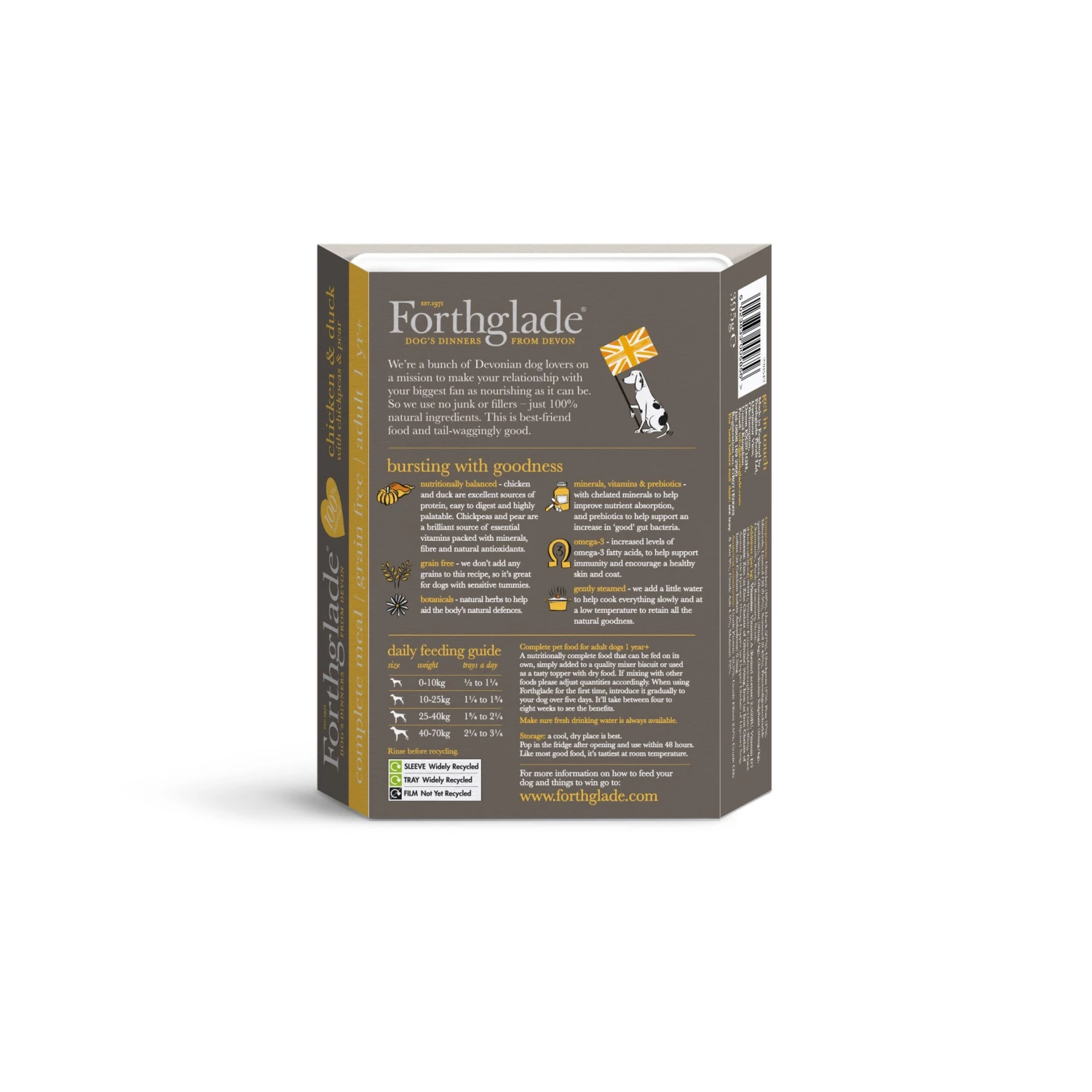 Composition: Chicken (48%), Duck (27%), Chick Peas (4%), Pear (4%), Minerals, Linseed Oil (0.5%), Seaweed (0.45%), Fructooligosaccharide (prebiotic), Yucca, Glucosamine (50mg/kg), Chondroitin Sulphate (50mg/kg), Camomile, Parsley, Rosemary, Nettle