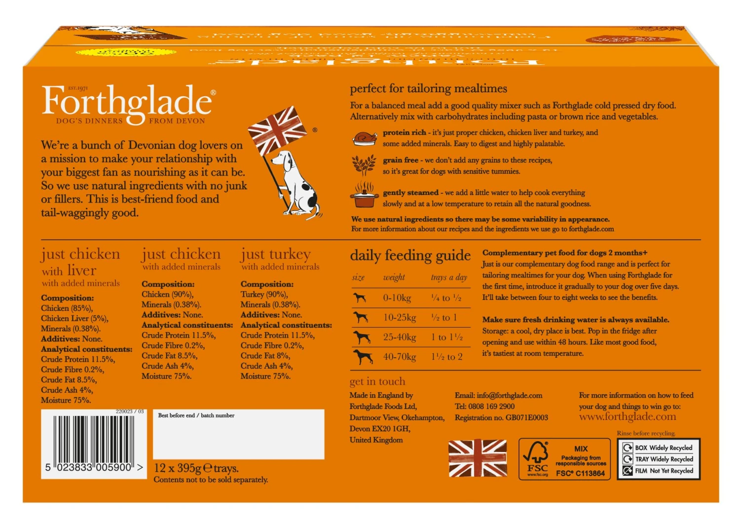 Our poultry Just variety pack is the perfect way to vary mealtimes for your four-legged friend. Including 3 poultry recipes, each tail-waggingly tasty tray contains just 90% good quality chicken, turkey & chicken with liver along with naturally occurring minerals & a little water to help us gently steam the recipe. A simple, honest & protein-packed companion to help tailor mealtimes for your four-legged friend.