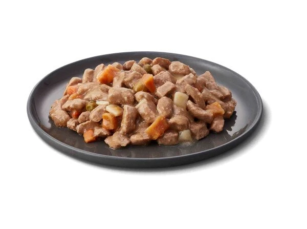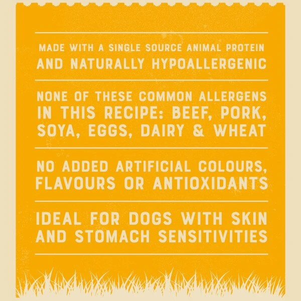Composition: lamb (27.7%), pea starch, pea protein, dried carrots (1.0%, equivalent to 8.1% carrots), dried potatoes (1%, equivalent to 4.3% potatoes), dried peas (1.0%, equivalent to 3.4% peas), sugar beet pulp, calcium carbonate, sodium chloride, dextrose, sunflower oil (0.42%), monopotassium phosphate, sodium tripolyphosphate, linseed oil (0.24%), alfalfa, seaweed (0.13%), fish oil (0.1%), tomato powder, magnesium oxide.