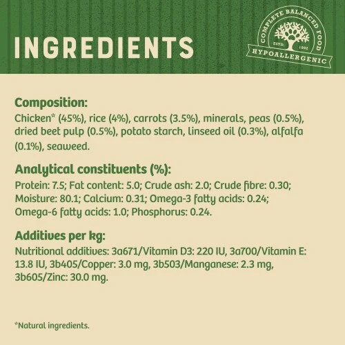 chicken* (45%), rice (4%), carrots (3.5%), minerals, peas (0.5%), dried beet pulp (0.5%), potato starch, linseed oil (0.3%), alfalfa (0.1%), seaweed. *Natural ingredients.