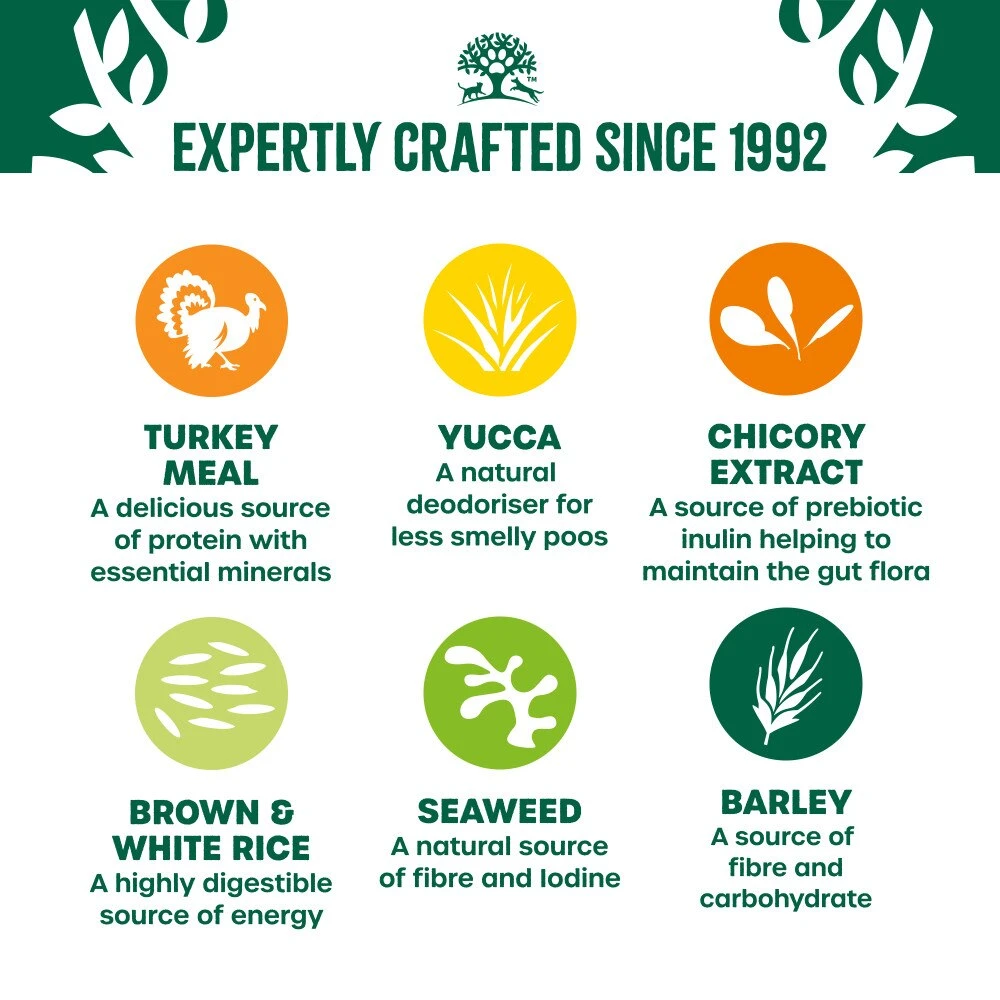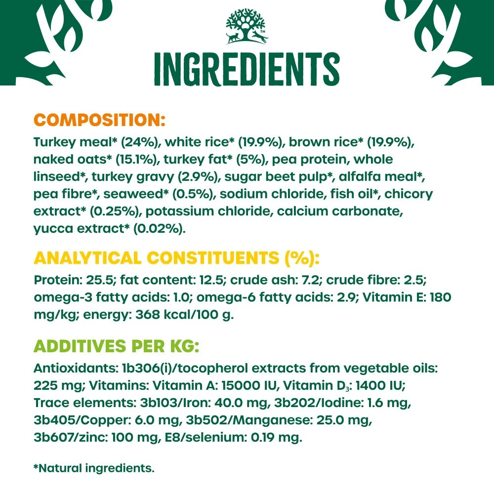 Minimum Levels: turkey (26%), rice (26%), oats (15%), linseed (3%), turkey gravy (2%), alfalfa (1%), seaweed (0.5%), yucca extract (0.02%), chicory extract (0.2%).