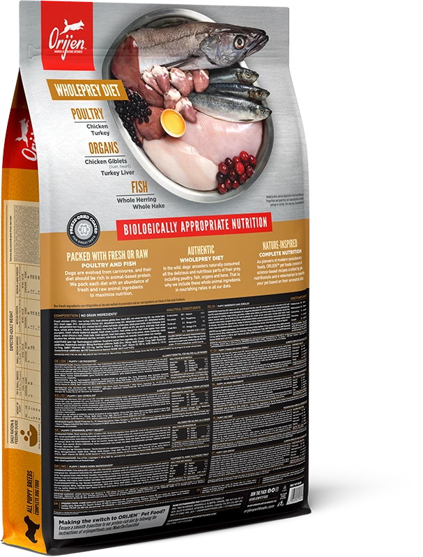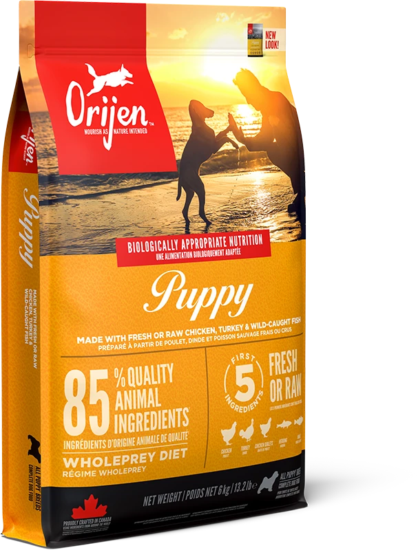 Help your puppy thrive with the power of protein-rich recipes that provide peak nourishment. All puppies do best on a Biologically Appropriate diet rich in protein and fat from quality animal ingredients to support their development. ORIJENâ„¢ Puppy diet is packed with 85%* quality animal ingredients like fresh or raw free-run** chicken and turkey, and wild-caught or sustainably farmed fish. Packed with WholePrey animal ingredients like organs and bone, ORIJEN food is made with the most nutrient-dense, succulent parts of the prey to deliver the nutrition puppies need. The result is a diet for your canine companion that is beyond comparison.