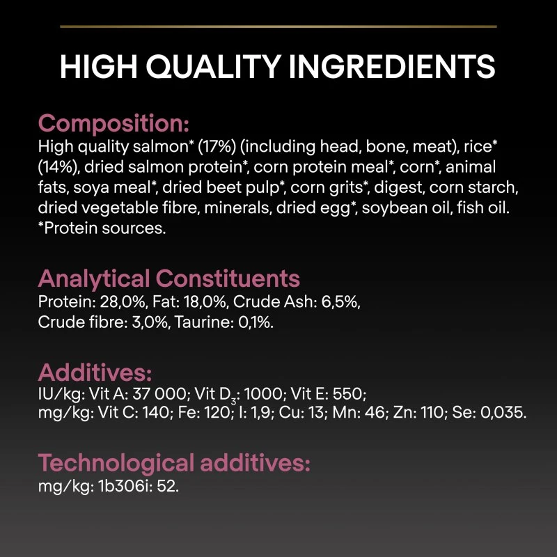 Main Ingredient: The main ingredient is salmon (17%), a really great protein source; much better than most diets that use cereal as the main ingredient!