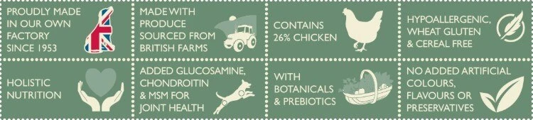 Vitalin Adult has been carefully formulated as a nutritionally complete dog food with a balanced recipe for adult dogs to provide all the nutrients required for a happy and healthy life. This hypoallergenic, wheat gluten free and cereal/grain free food contains high quality protein from 100% British Chicken with potatoes, nutrient packed botanicals and joint supplements.